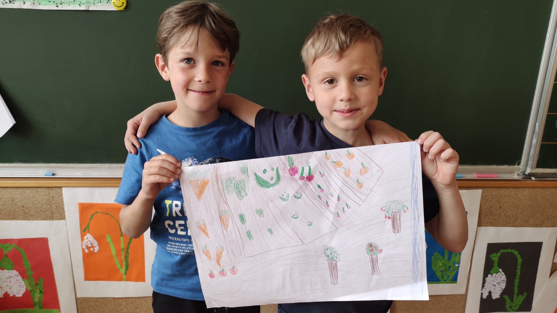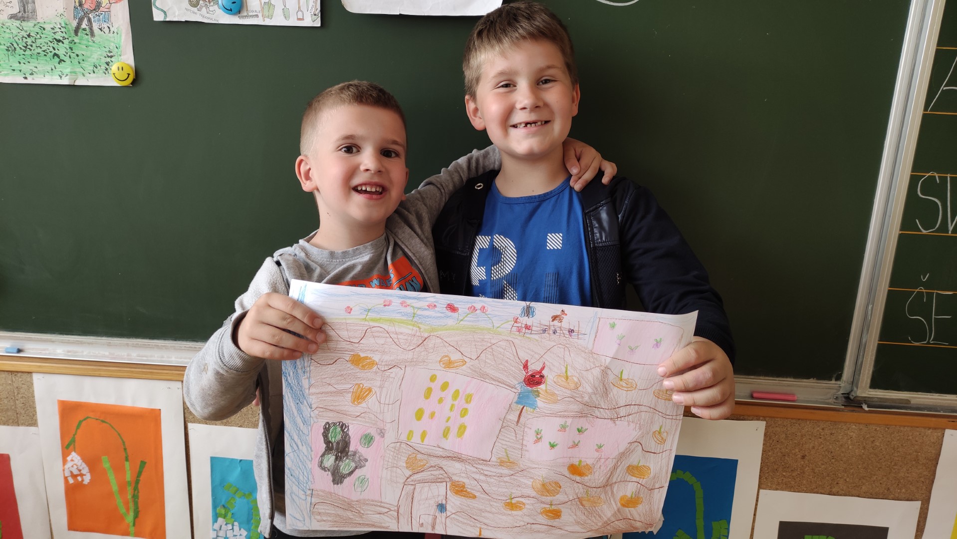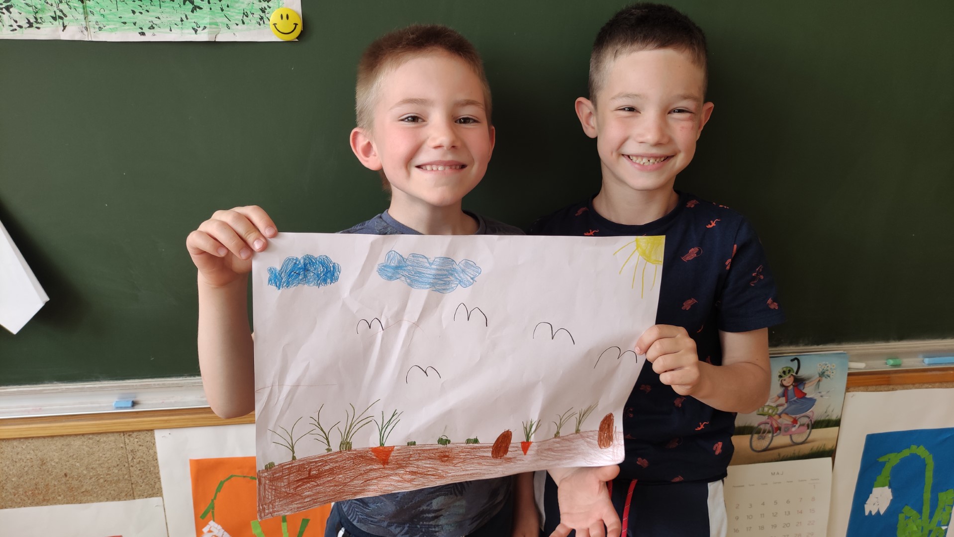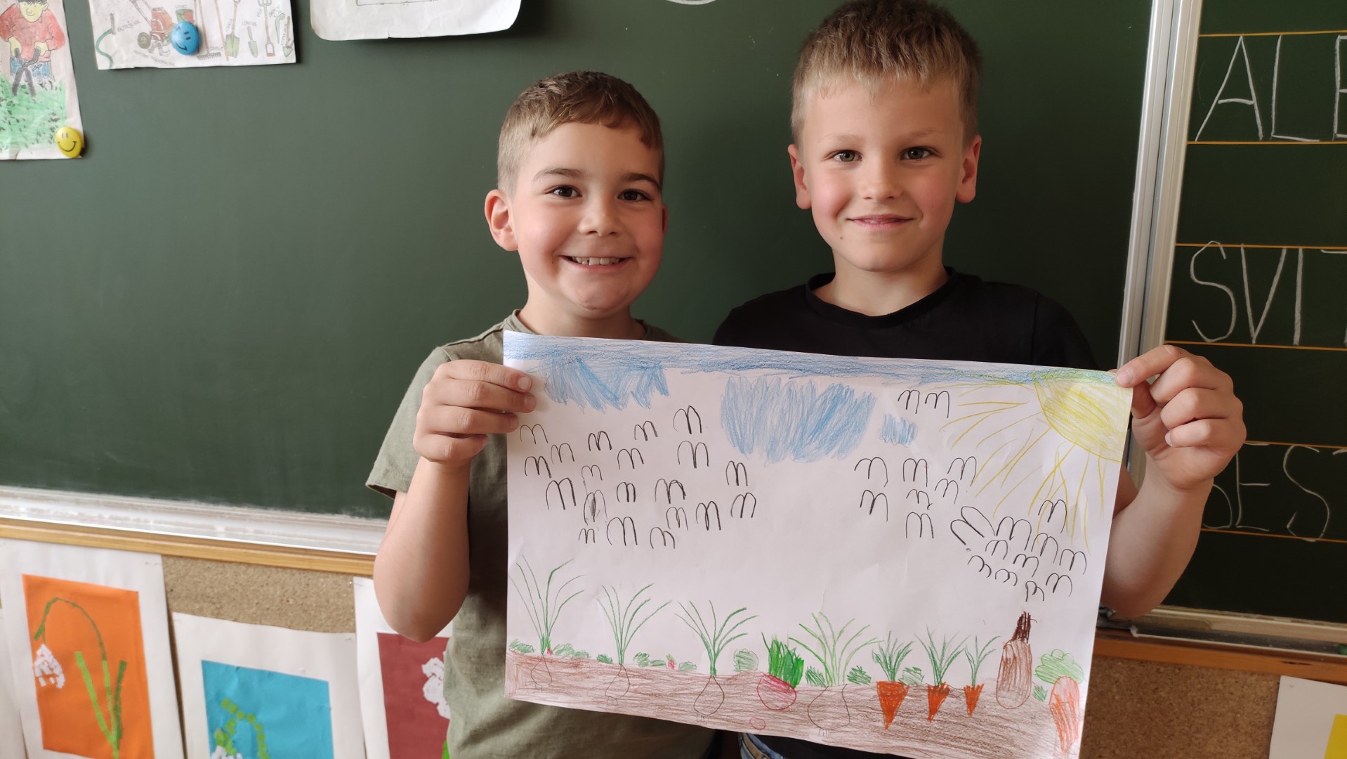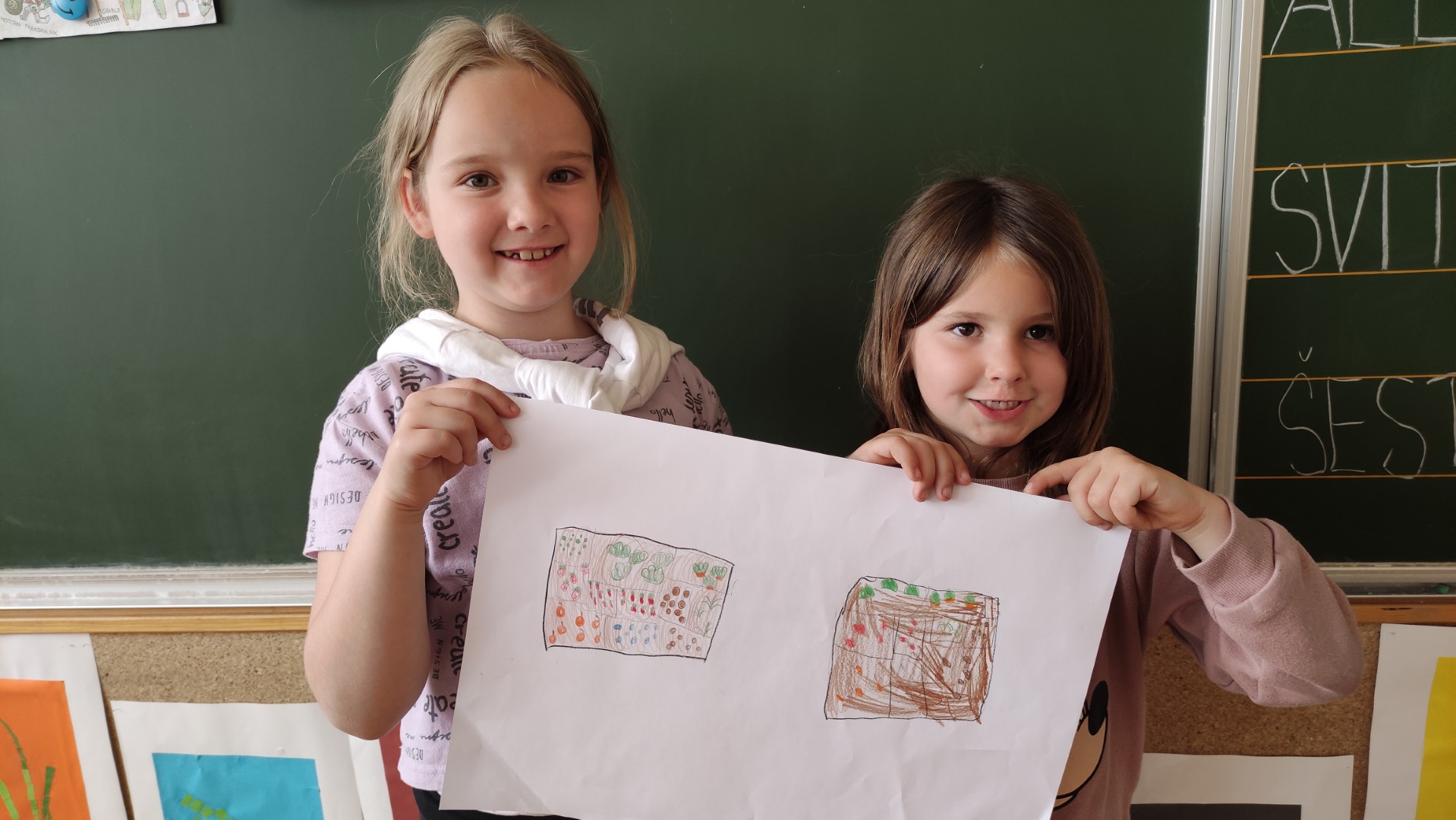 V podaljšanem bivanju 1. a in 1. b smo malce vrtnarili v parih. Na listih so nastali naši vrtovi. Kako zdravo bomo jedli!
