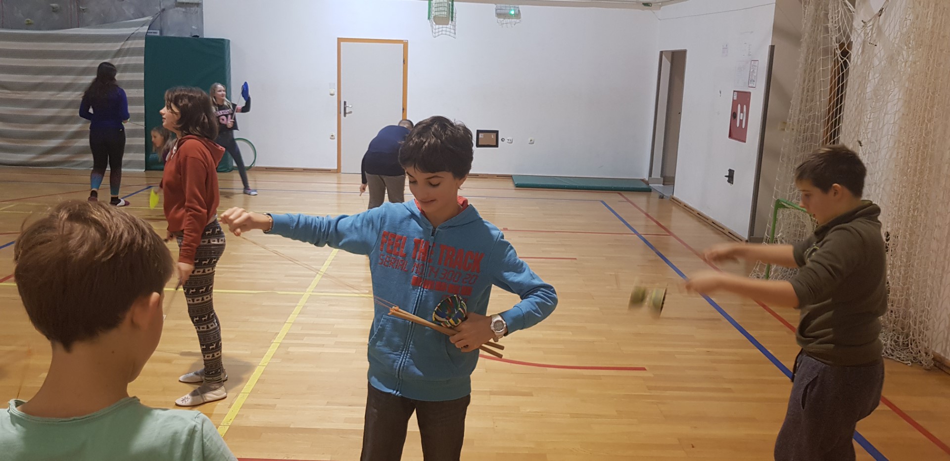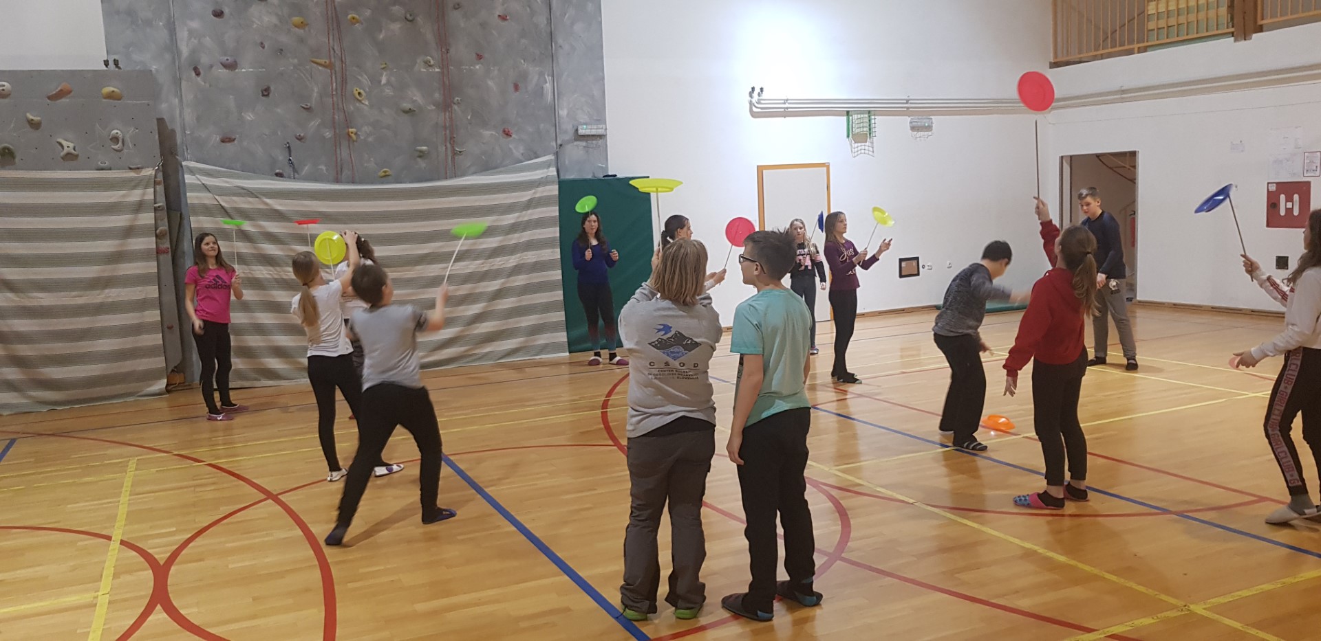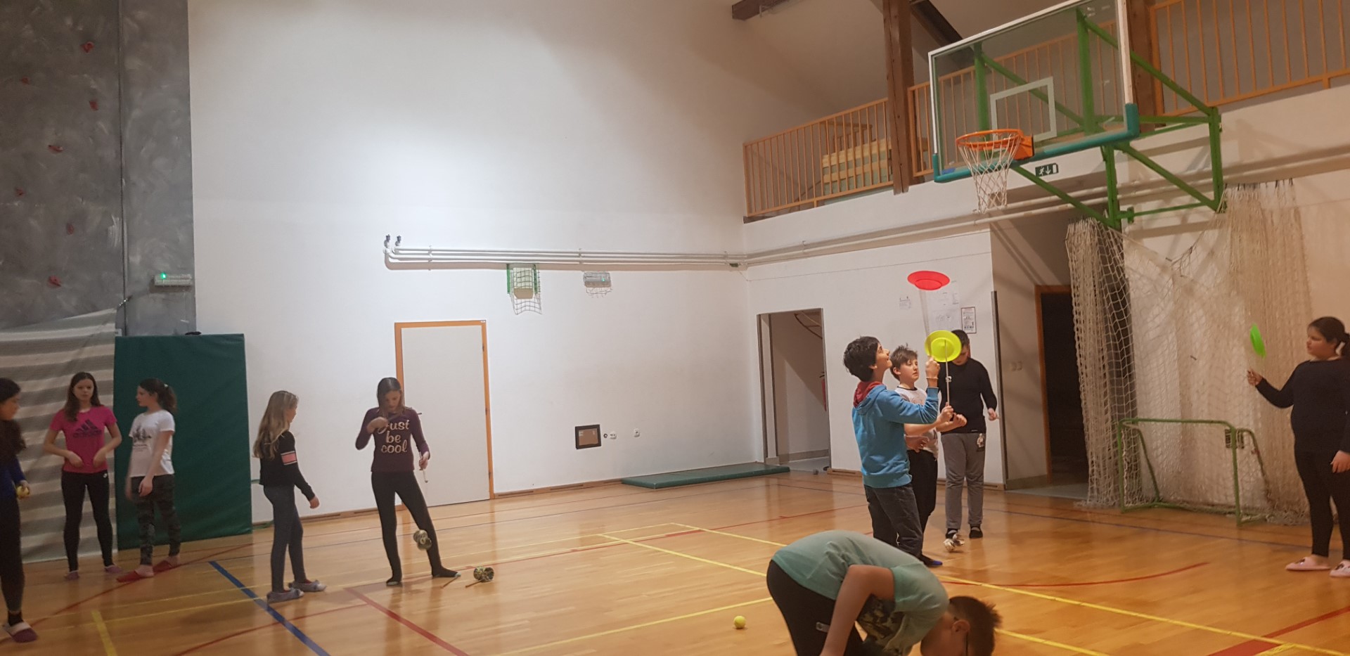 Sreda je bila pestra. Smučanju, ki nam gre že odlično, smo popoldan dodali še športne igre v telovadnici in obvezno branje dnevnika. Ob koncu dneva smo se poizkusili še v cirkuških vragolijah in družabnih igrah.