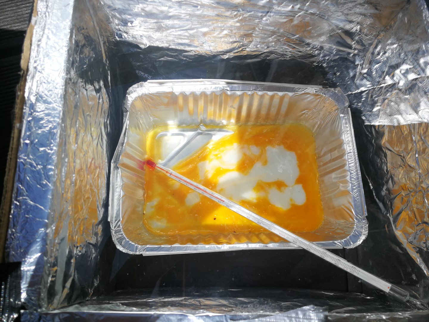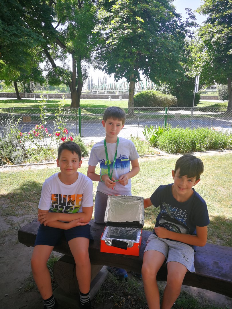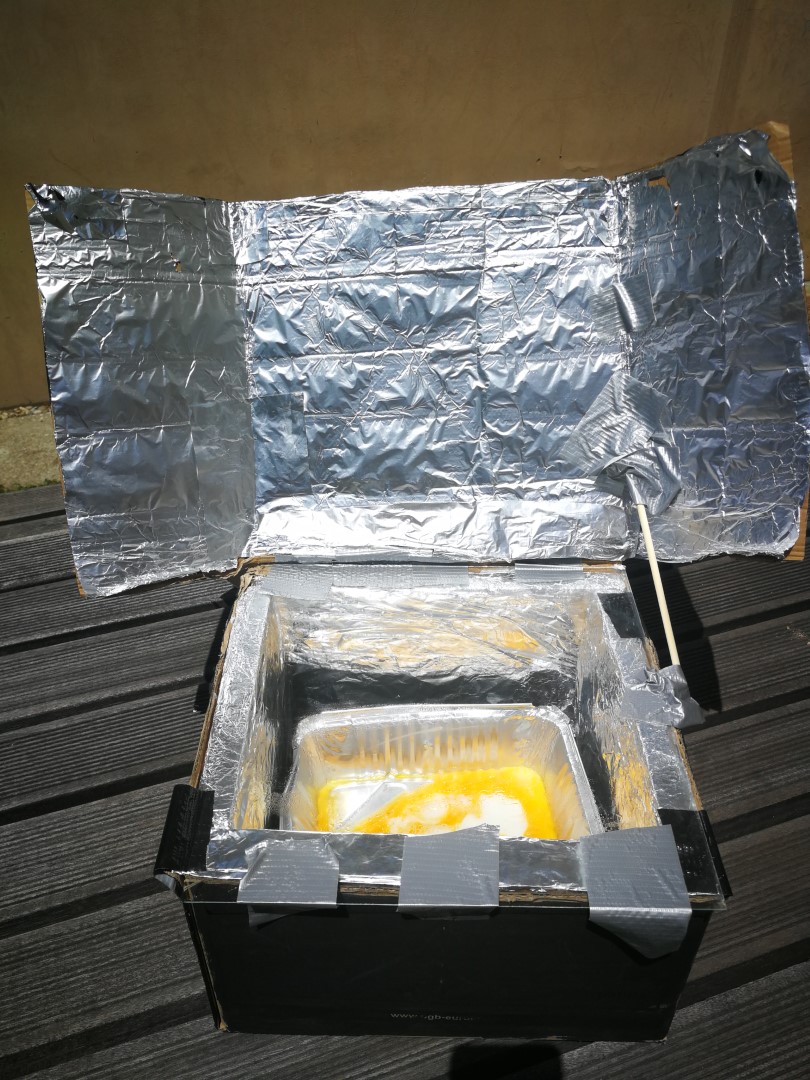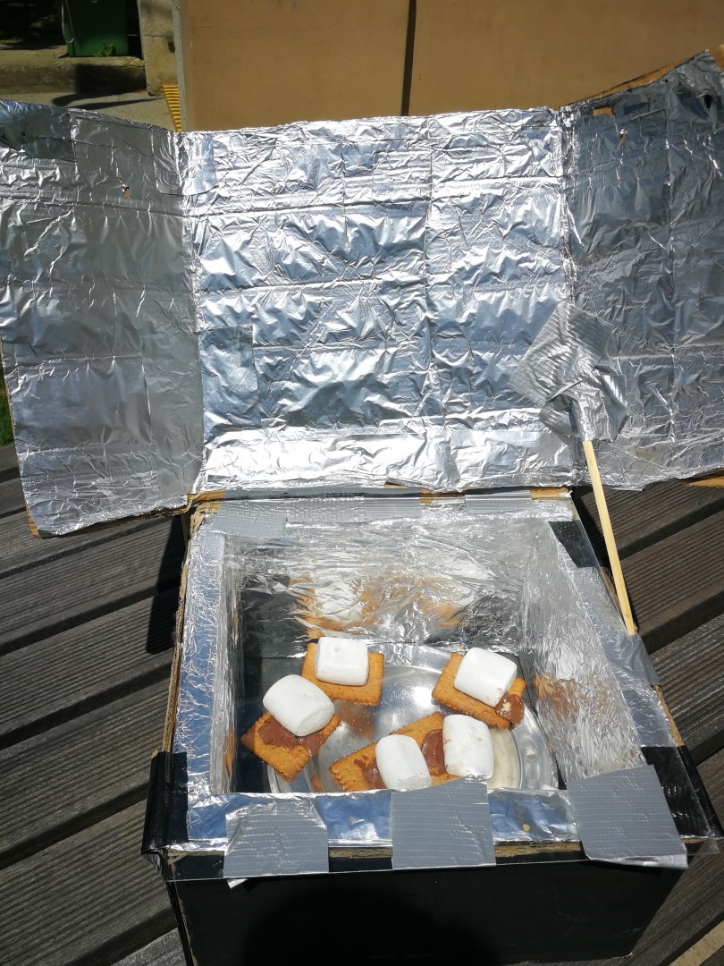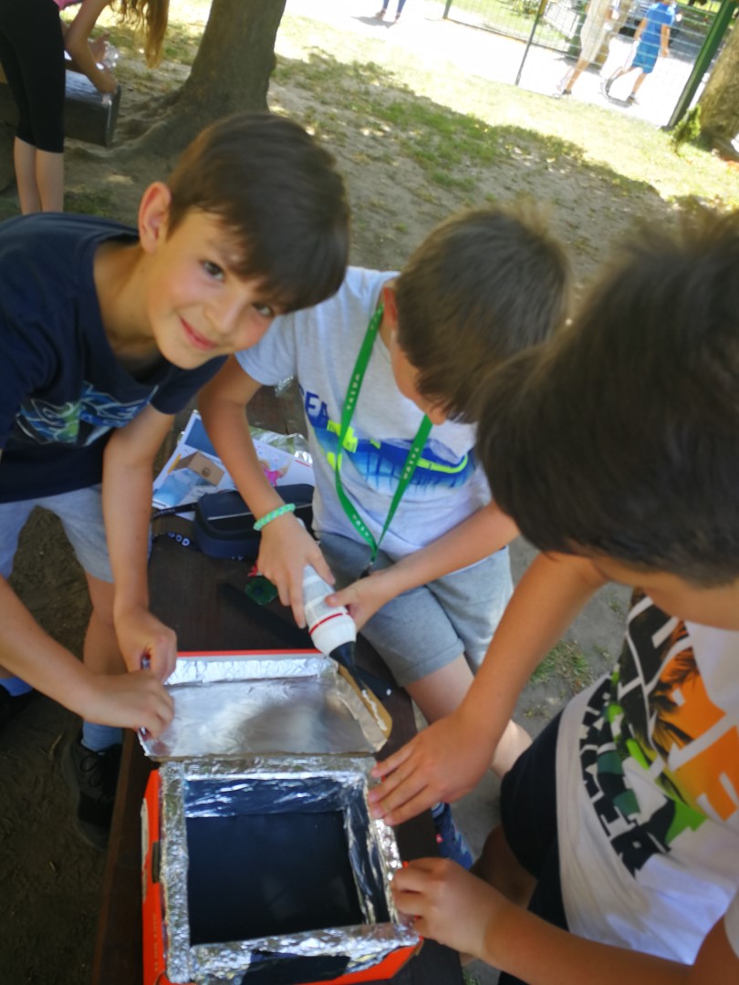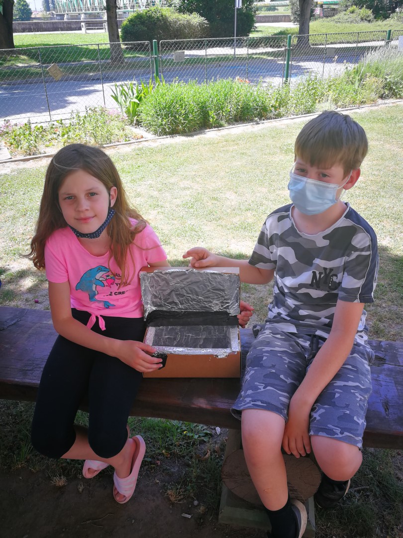 Posebaj smo se osredotočili na sončno energijo, katero smo uporabili za kuhanje in pečenje. Izdelali smo solarni kuhalnik iz kartonske škatle in alufolije ter stekla. S pomočjo ulovljenih sončnih žarkov smo spekli jajce pri temp. 70 C, ter penice s čokolado in keksi, katere smo tudi preizkusili. Jajce se je peklo približno 1 uro. S tem nismo onesnaževali okolja, uporabili obnovljivi vir in sklenili, da ga bomo še razvijali naprej.