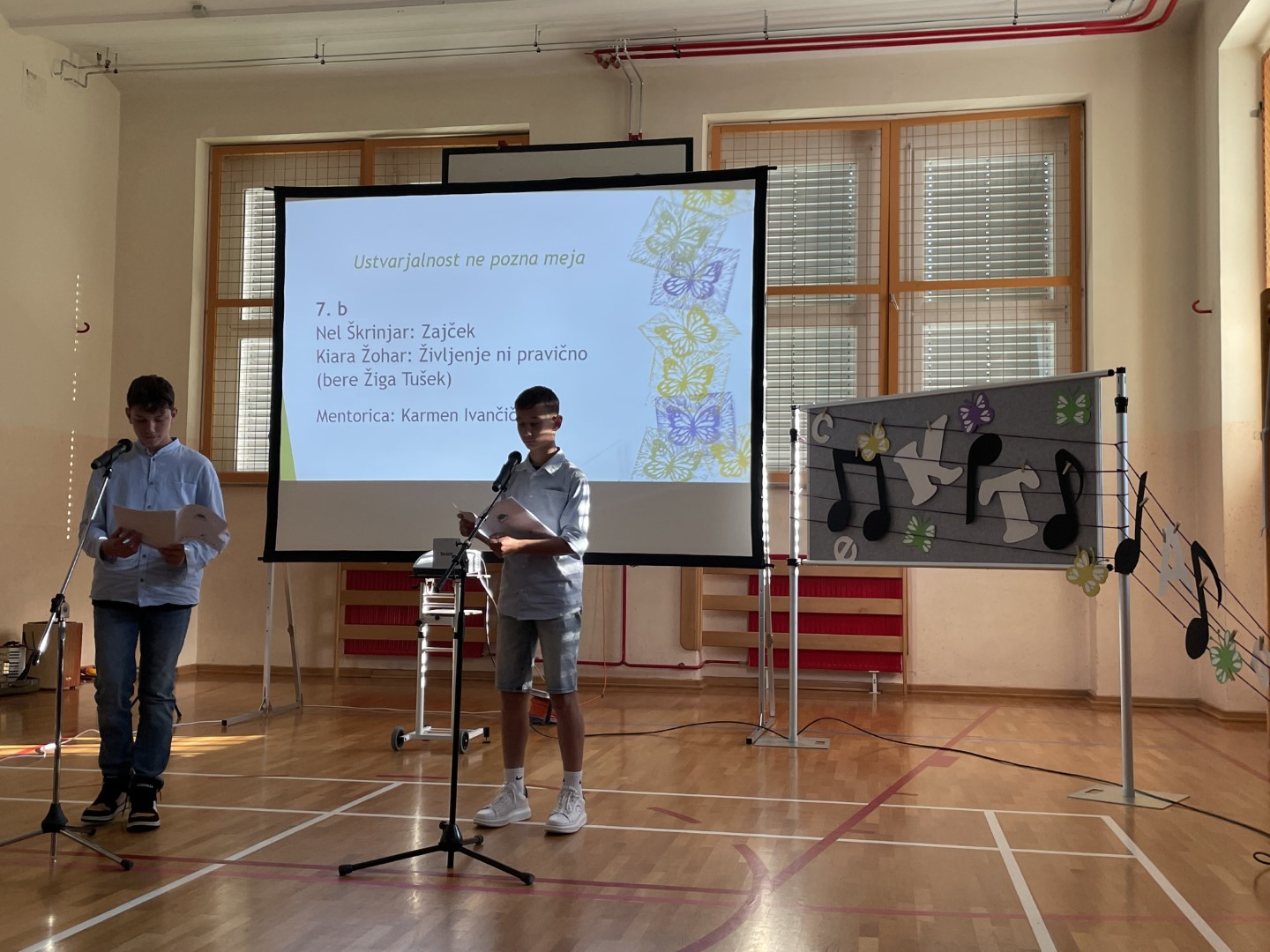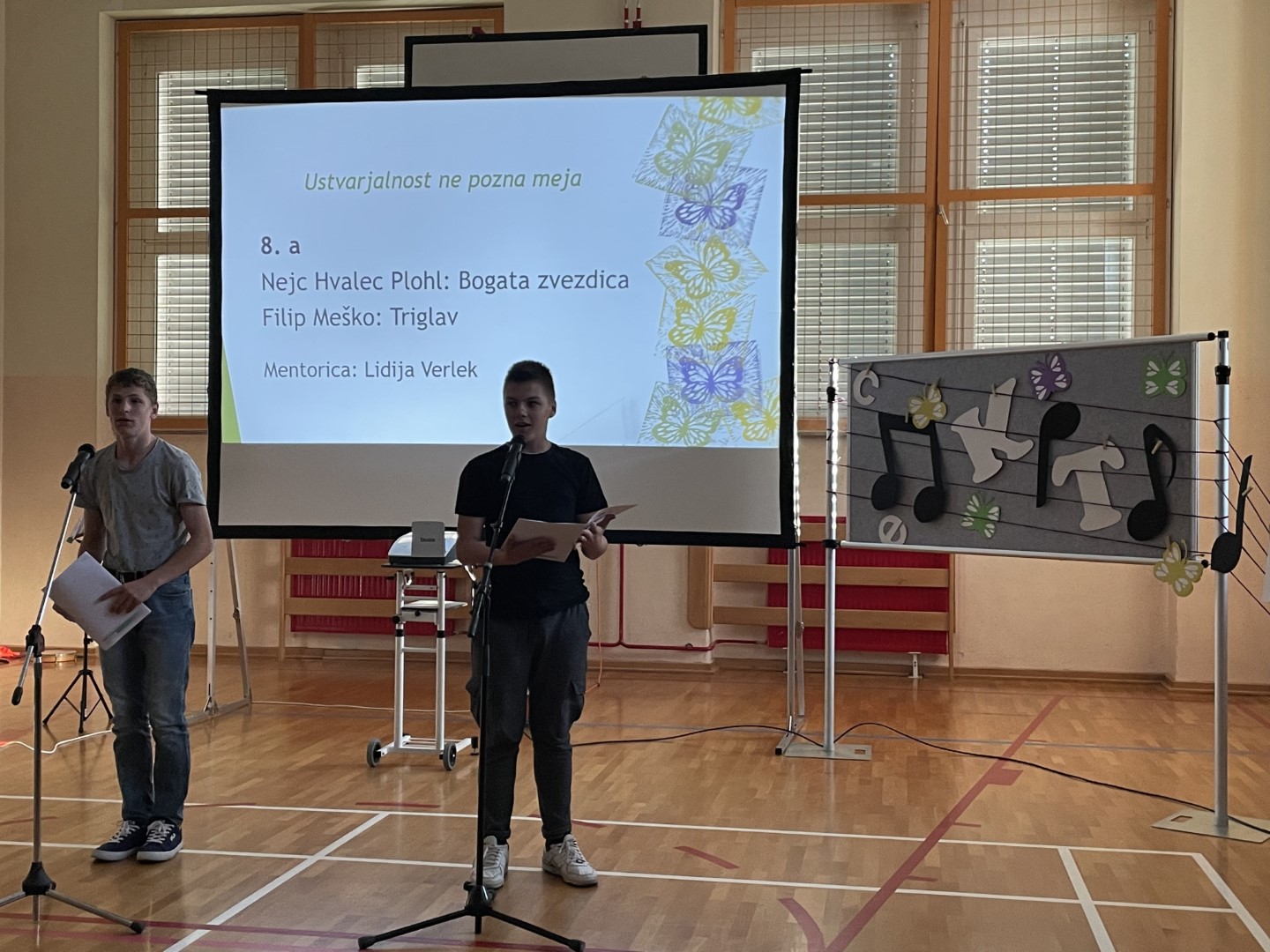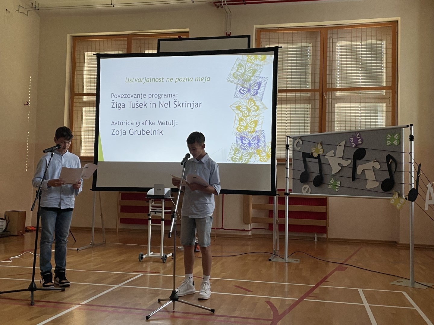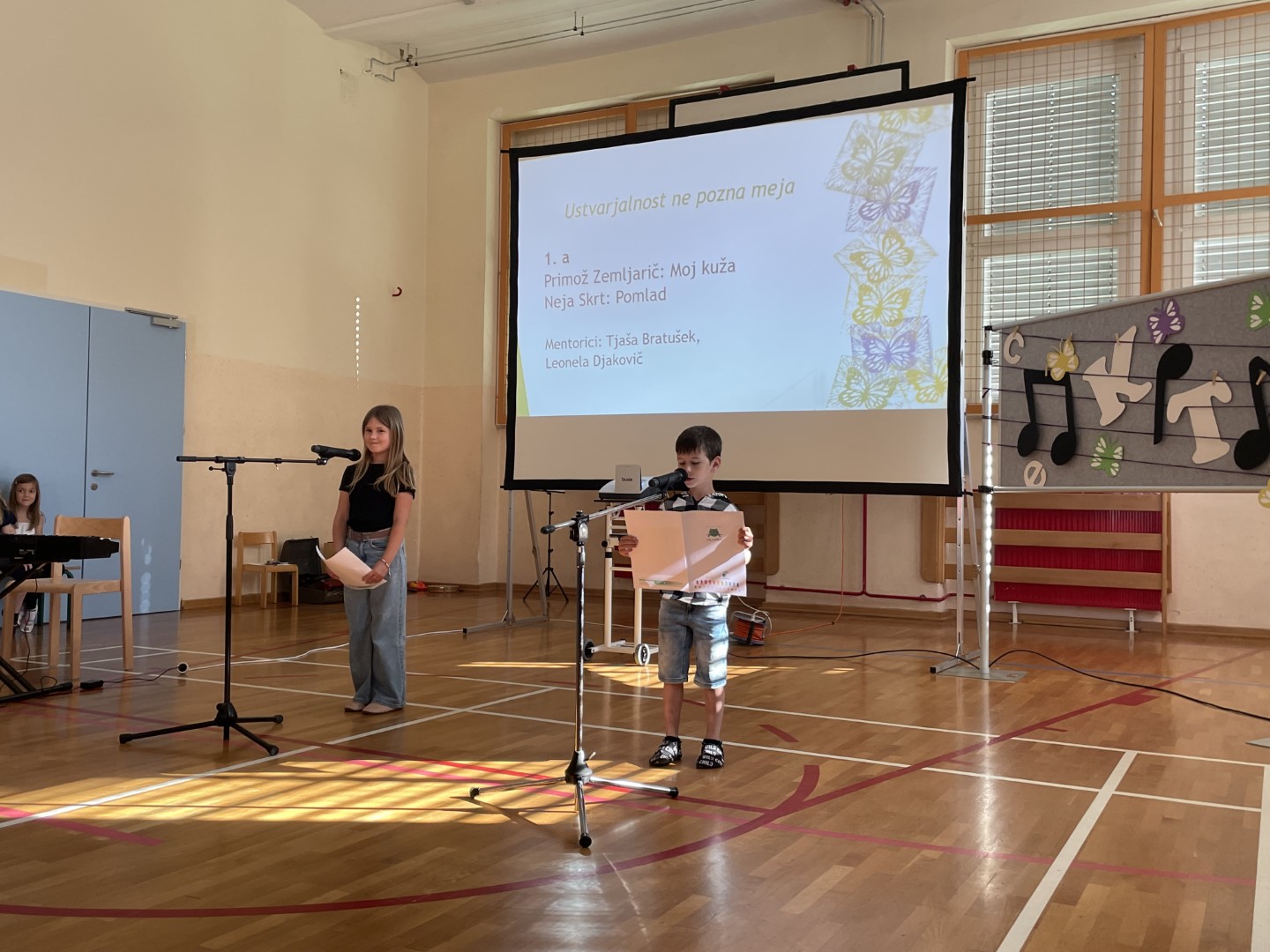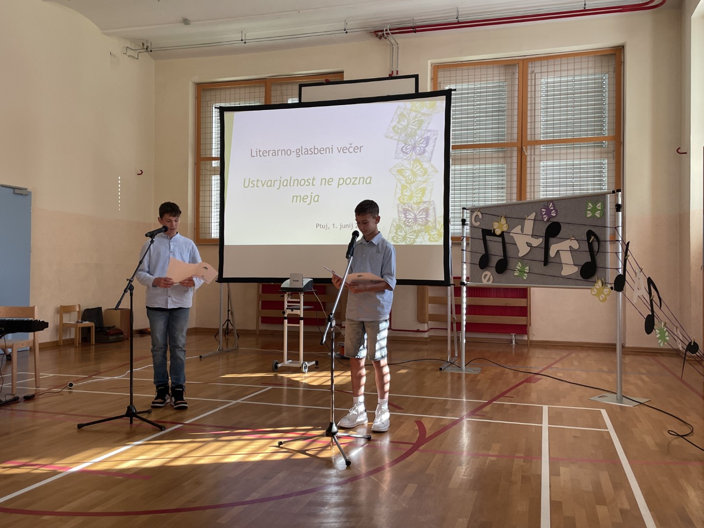 V četrtek, 1. junija 2023, so naši učenci na literarno-glasbenem večeru Ustvarjalnost ne pozna meja predstavili svoje pesmi, zgodbe in razmišljanja. Nekateri so se izrazili skozi glasbo in nam zapeli, zaigrali ter zaplesali.
