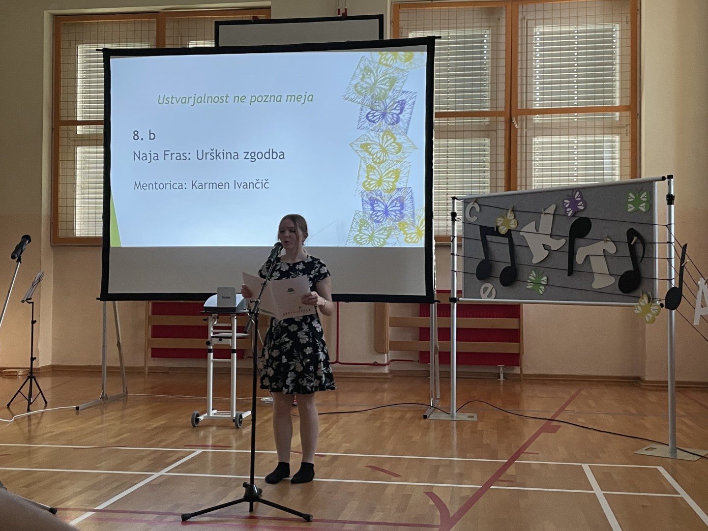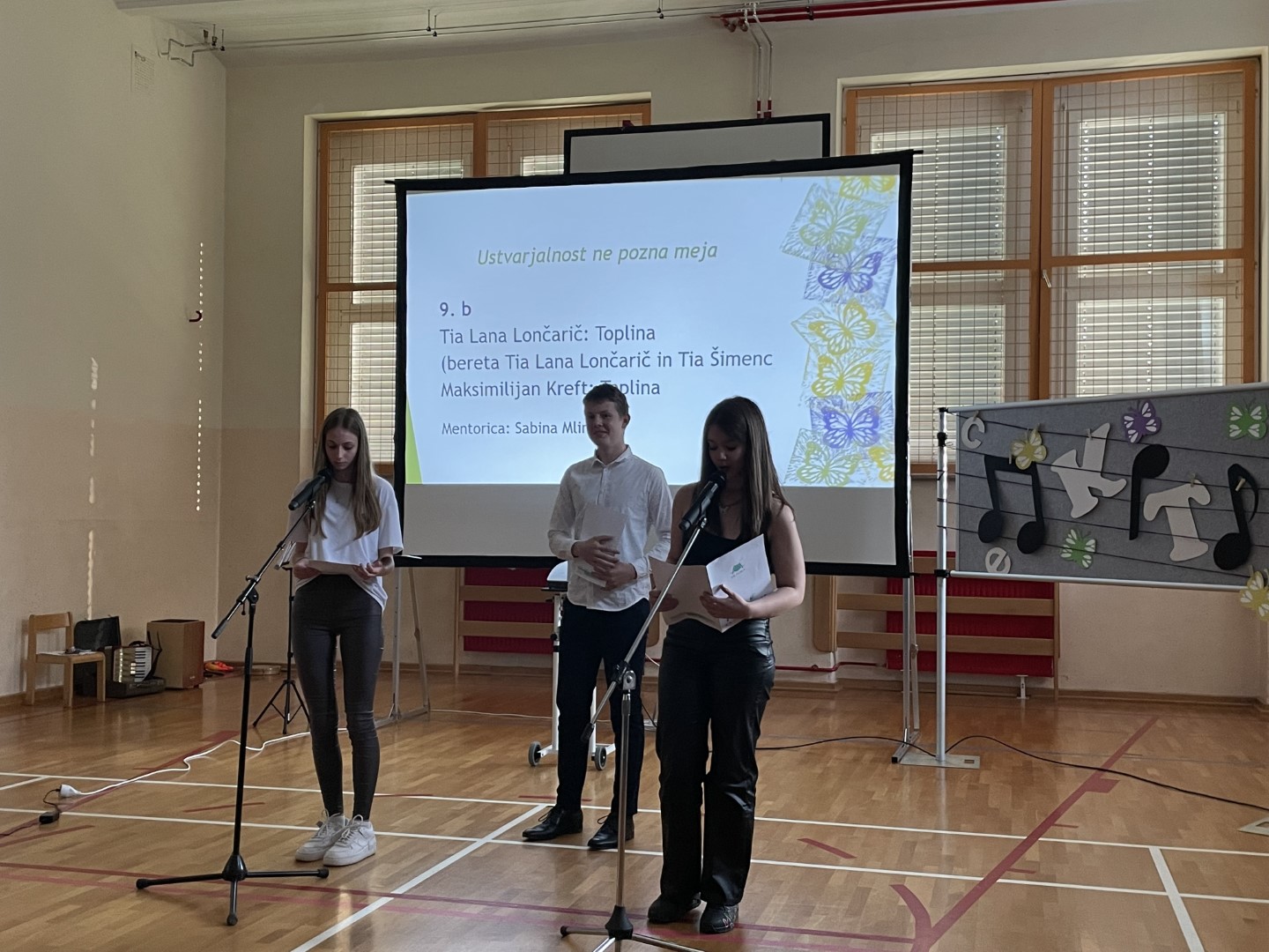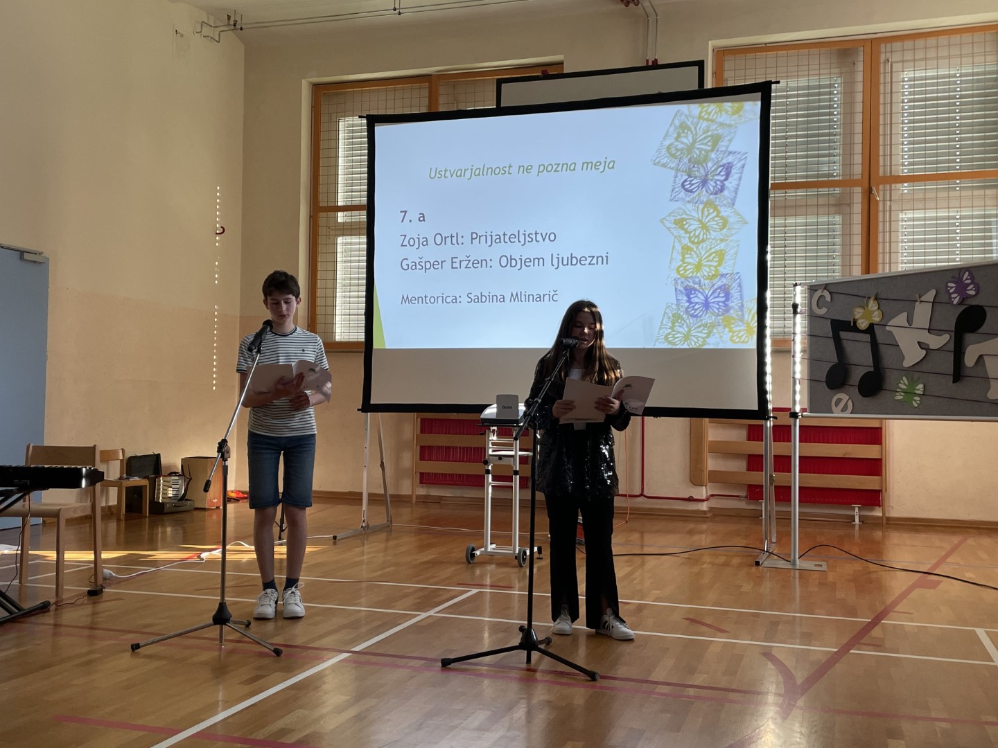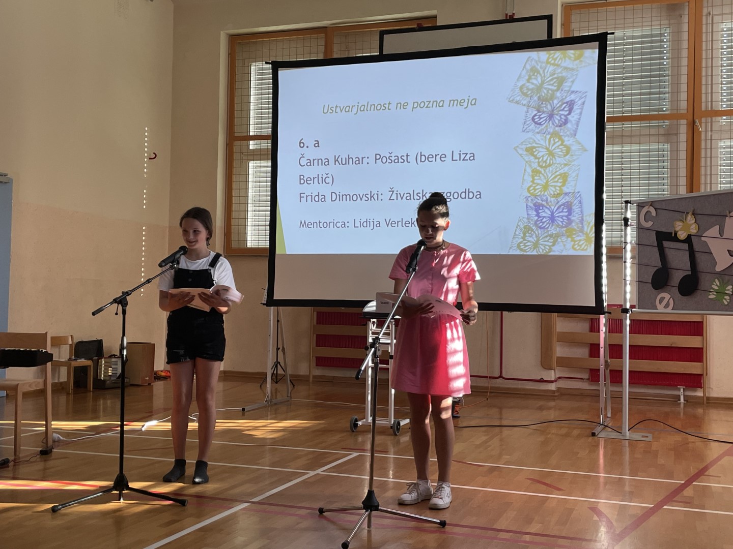V četrtek, 1. junija 2023, so naši učenci na literarno-glasbenem večeru Ustvarjalnost ne pozna meja predstavili svoje pesmi, zgodbe in razmišljanja. Nekateri so se izrazili skozi glasbo in nam zapeli, zaigrali ter zaplesali.