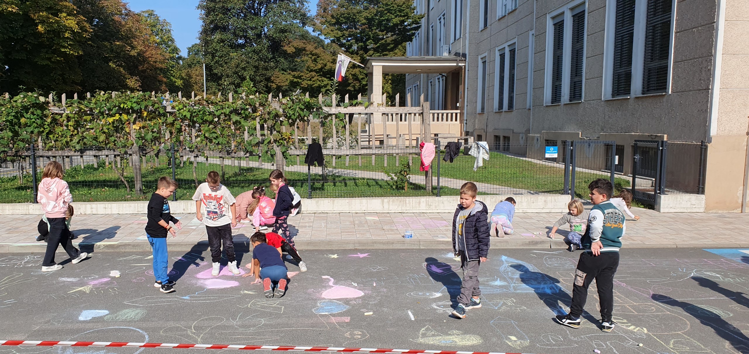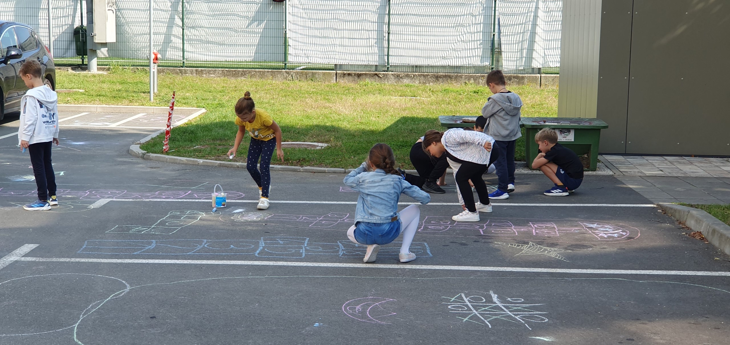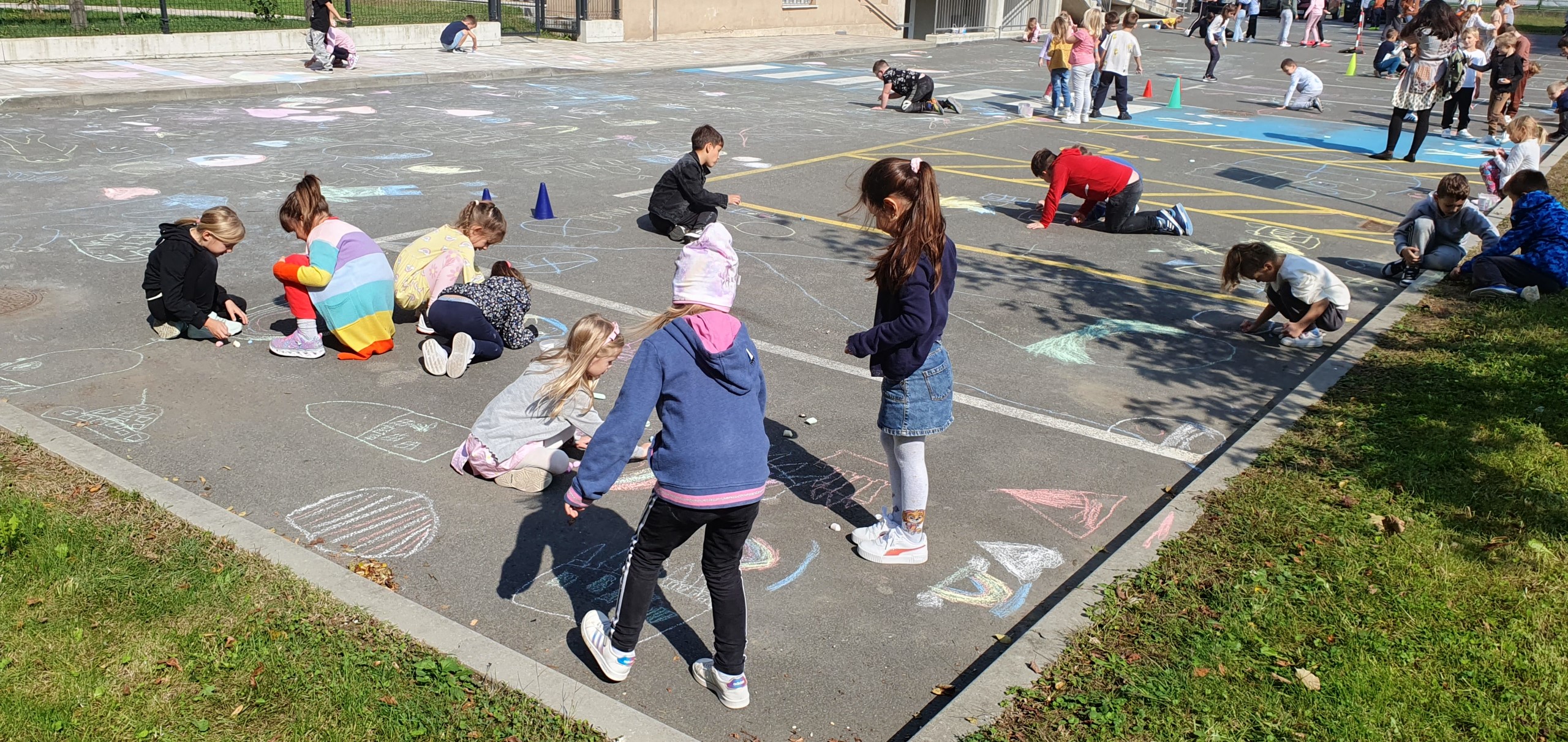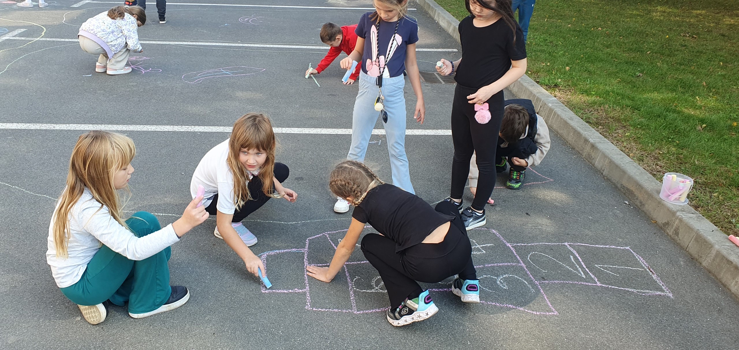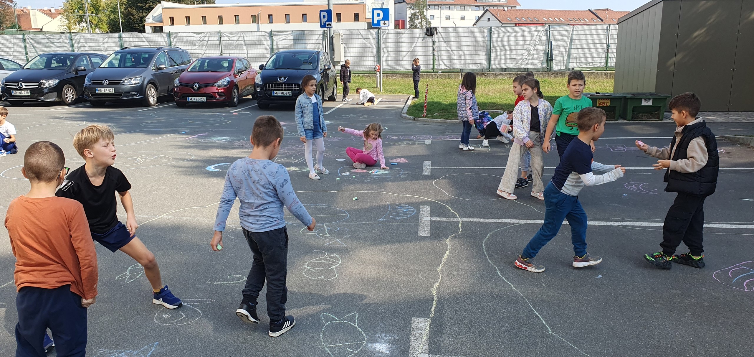 Otroci v parku ali telovadnici ne morejo risati na tla, zato smo našim otrokom omogočili ustvarjanje s kredami na našem šolskem parkirišču.