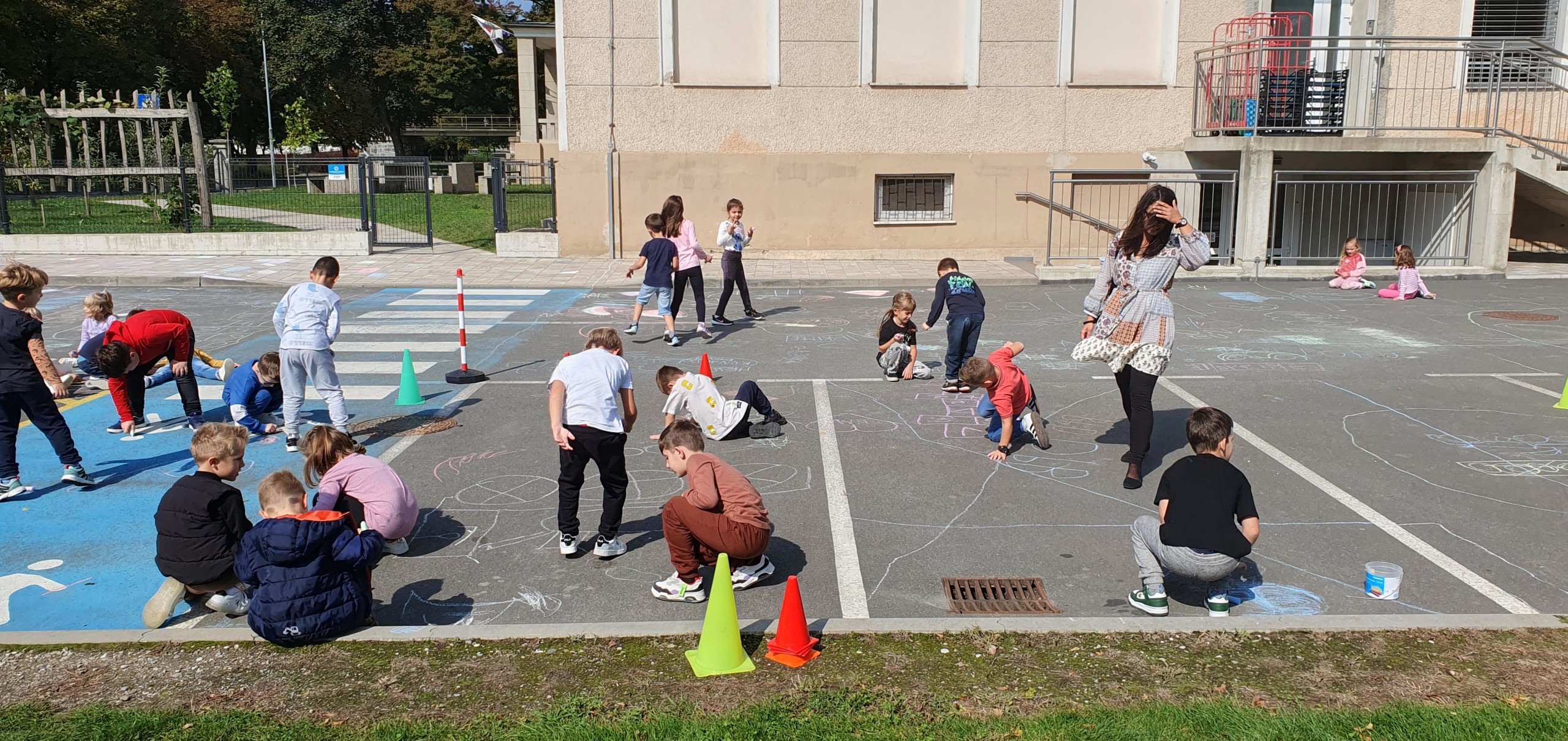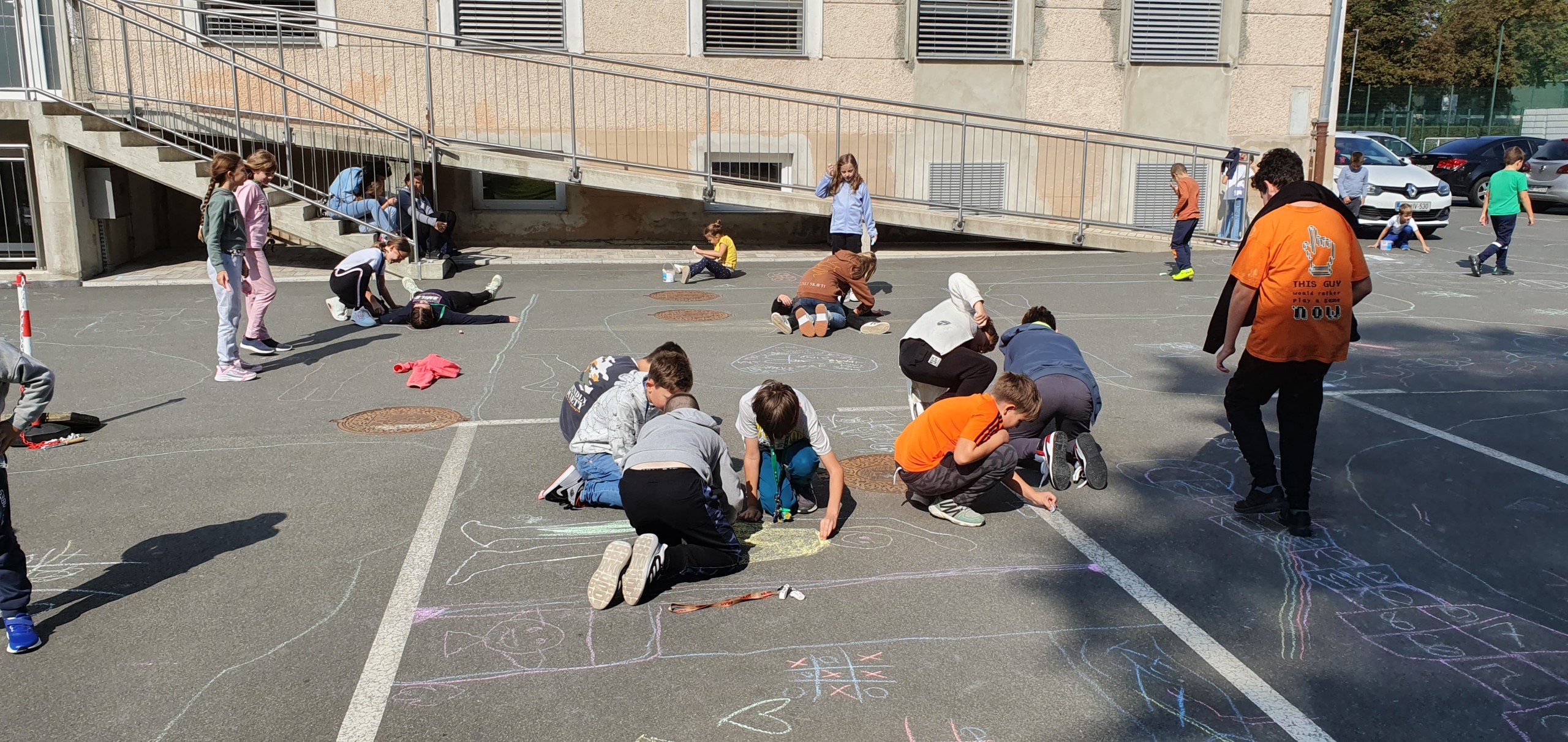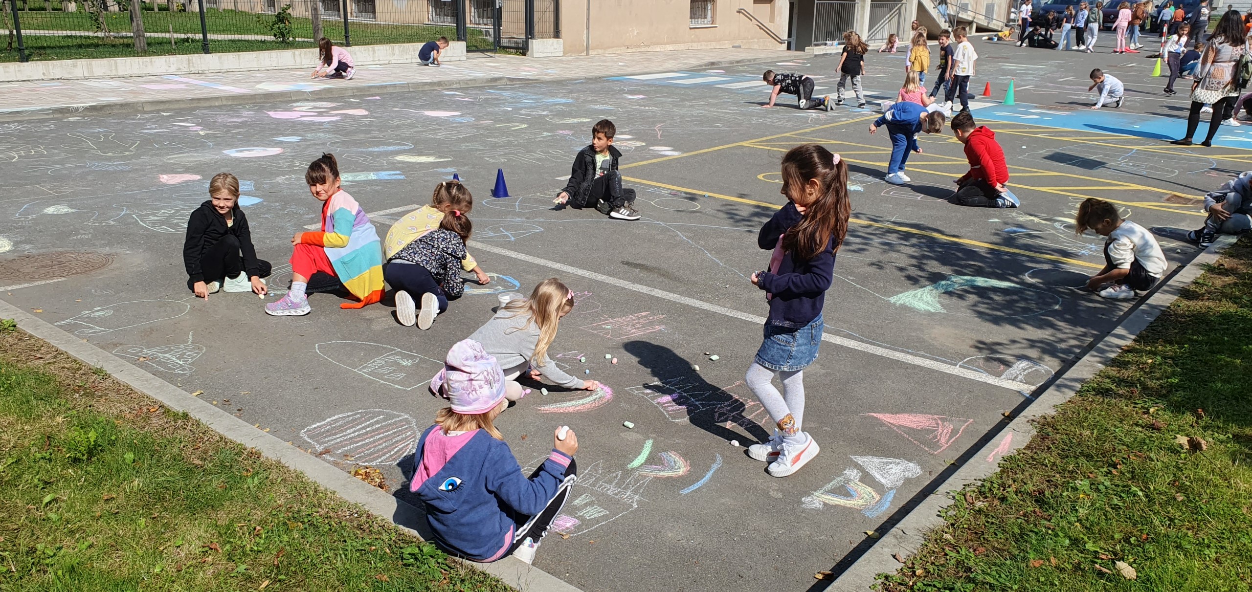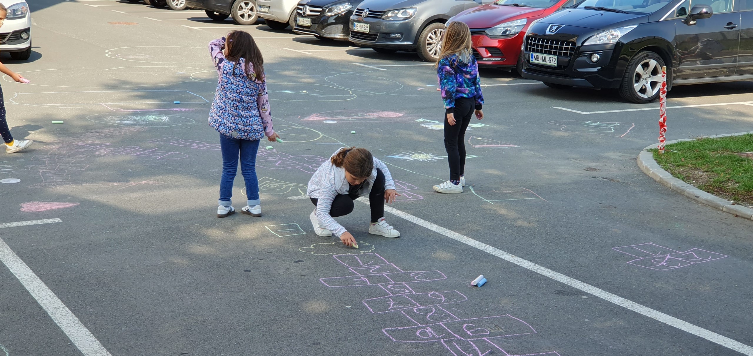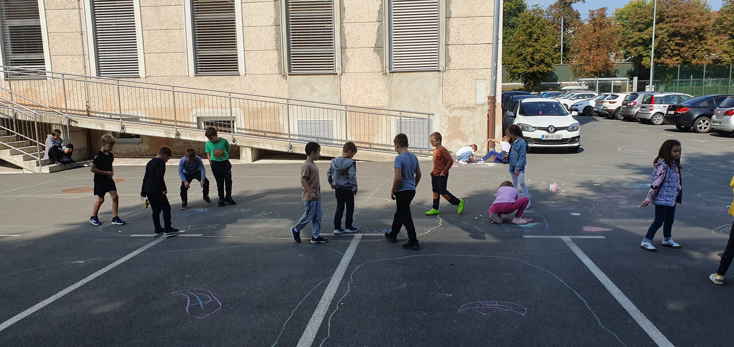 Otroci v parku ali telovadnici ne morejo risati na tla, zato smo našim otrokom omogočili ustvarjanje s kredami na našem šolskem parkirišču.