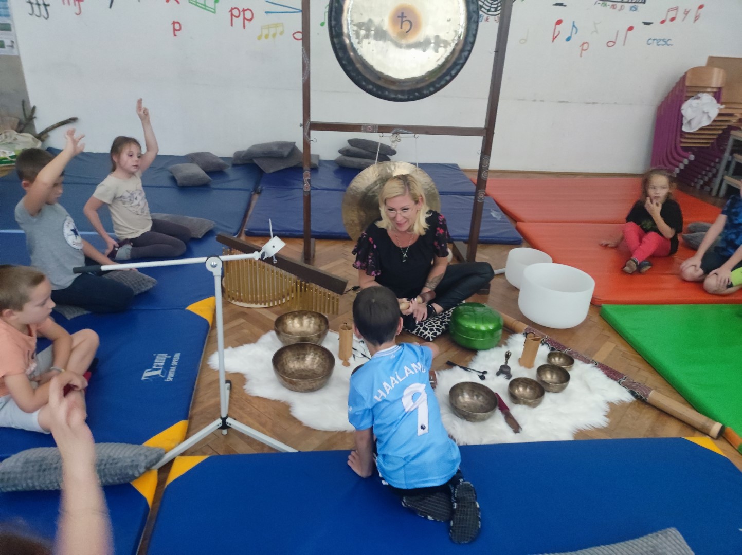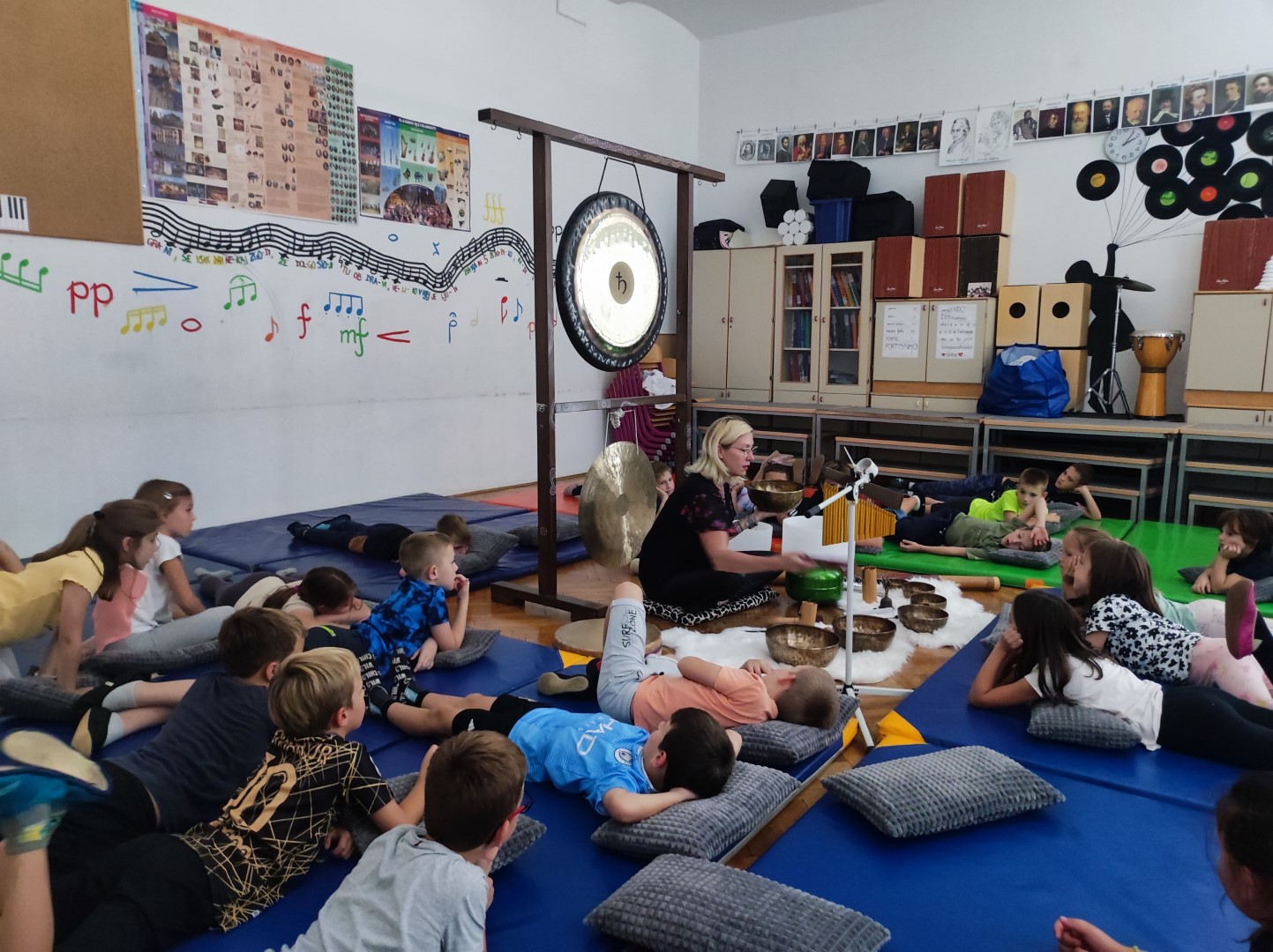 Ta teden smo popestrili OPB z otroško jogo, z zvočnimi kopeli v okviru glasbene umetnosti. Da glasba zdravi so že vedeli v stari Indiji in da terapevtsko vpliva na naše telo, smo raziskovali v okviru zvočnih delavnic z našo glasbeno pedagoginja Jasno in učiteljico angleščine Leonelo. Učenci so se sprostili ob zvokih himalajskih inštrumentov in nato tudi na njih zaigrali. Bilo je zelo zanimivo doživetje.