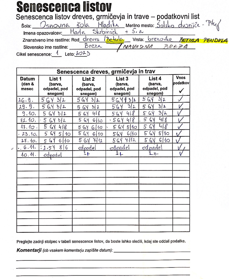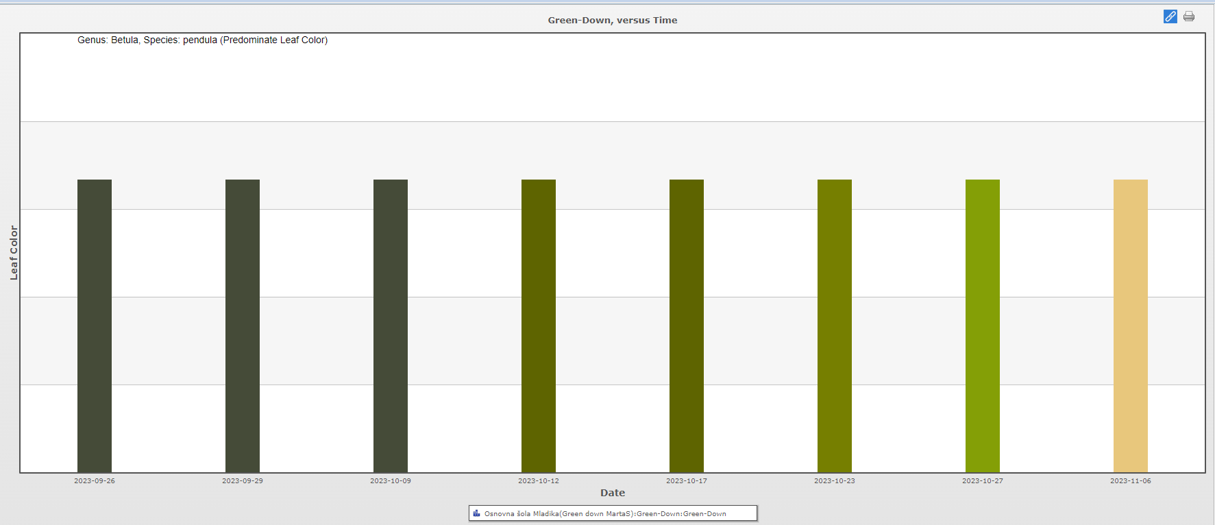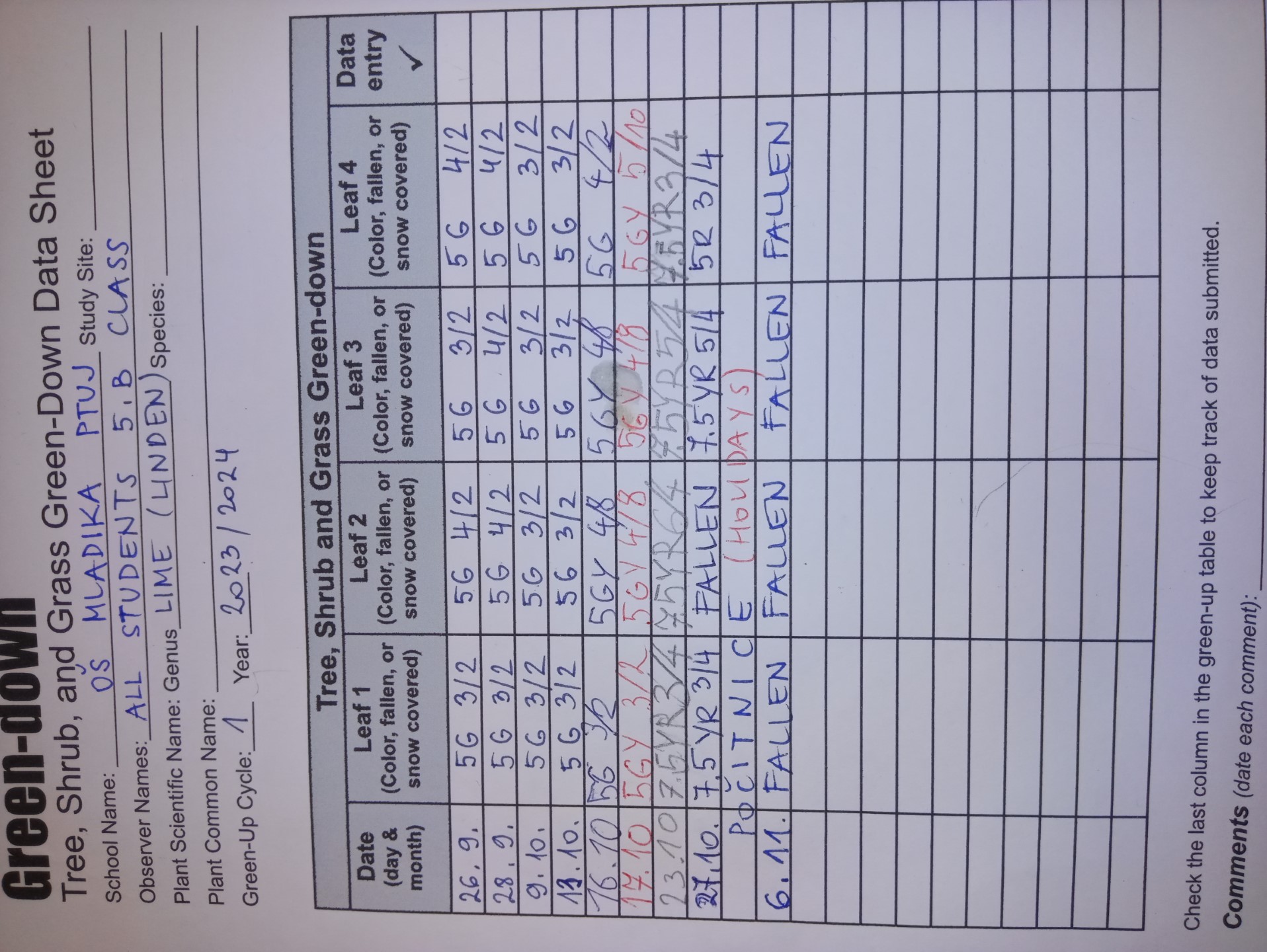 Z drugim projektom smo začeli v mesecu septembru. Določili smo si vejo na drevesu. Na tej veji je bilo 5 listov in mi smo 2x na teden opazovali spremembe v barvi teh listov. Vsak teden je prišlo do sprememb v drugačni obarvanosti listov. Učenci so uživali ob merjenju, opazovanju in vnašanju podatkov za naše drevo. Večkrat se še sedaj gremo tja igrat. Verjetno bomo začeli tudi z novim projektom Green Up spomladi.