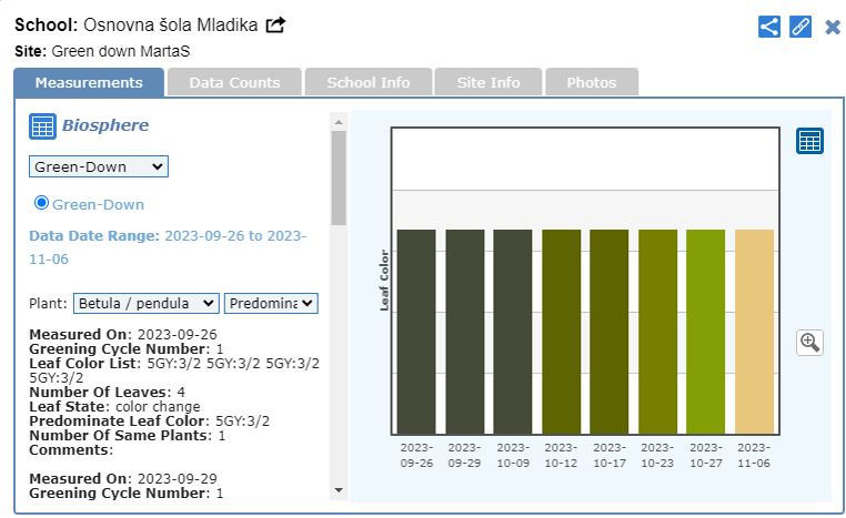 Izbrali smo si dva projekta. Prvi je merjenje temperature zemlje (Soil Temperature) na 5 cm in 10 cm. Vsak dan ob isti uri učenci gredo in izmerijo temperaturo tal. Dobljeni rezultati nam marsikaj povedo o globalnih spremembah. Drugi projekt pa je bil Green Down, kjer smo opazovali, merili in beleži podatke o spremembi barve listov – kako so se obarvali in kdaj so padli z drevesa.
