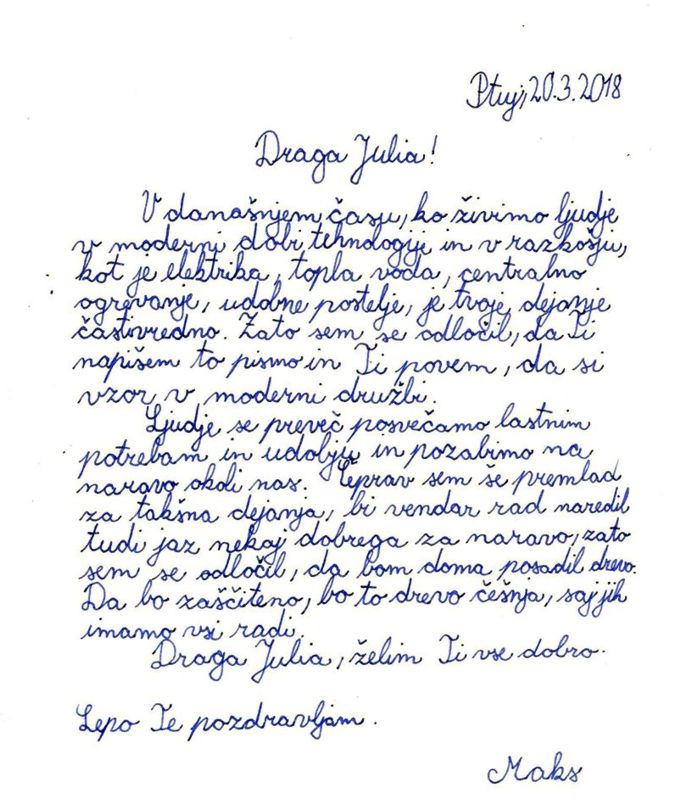 Rodila sem se v Sloveniji. Če smo bolj natančni, na Ptuju. Že od malega sem vajena dreves in narave. Če pomislim na otroška leta, se vedno spomnim, kako sem se igrala in plezala po drevesih. Nikoli si nisem mislila, da bi me lahko stvar, katere pomembnosti sploh nisem poznala, tako navdušila. A zdaj, ko sem starejša, vem, da so drevesa daleč od le plezalnih igrač. Drevesa so darilo narave. Drevesa nam dajejo kisik in senco v vročih dneh. Drevesa nam dajejo okusno sadje. In drevesa so vsak dan porezana v tisočih. So ena izmed največjih tržnih niš. Sekamo jih in jih uporabljamo v korist naših življenj in udobja. Ali mar ne vidimo, da nam že same od sebe dajejo vse, kar potrebujemo?